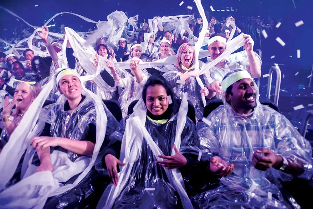 ステージから5列以内。備え付けのポンチョを着用の上お楽しみください。公演終了後、ブルーマンとの記念撮影があります。